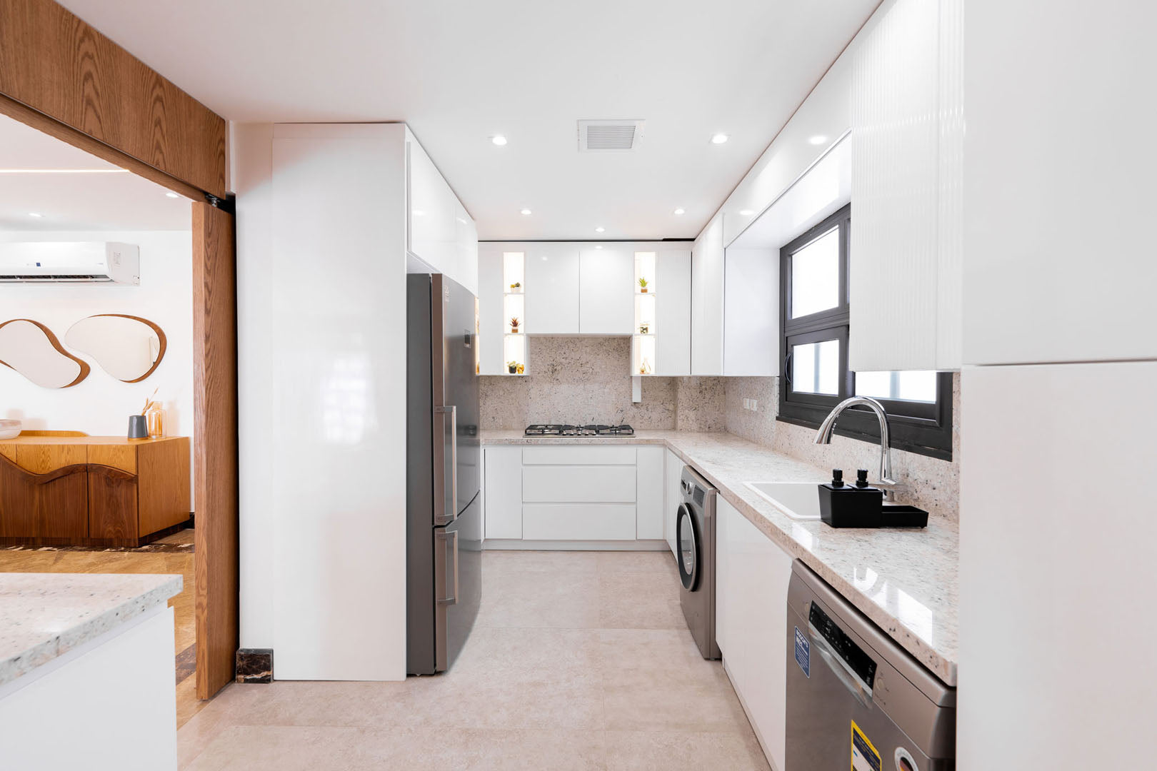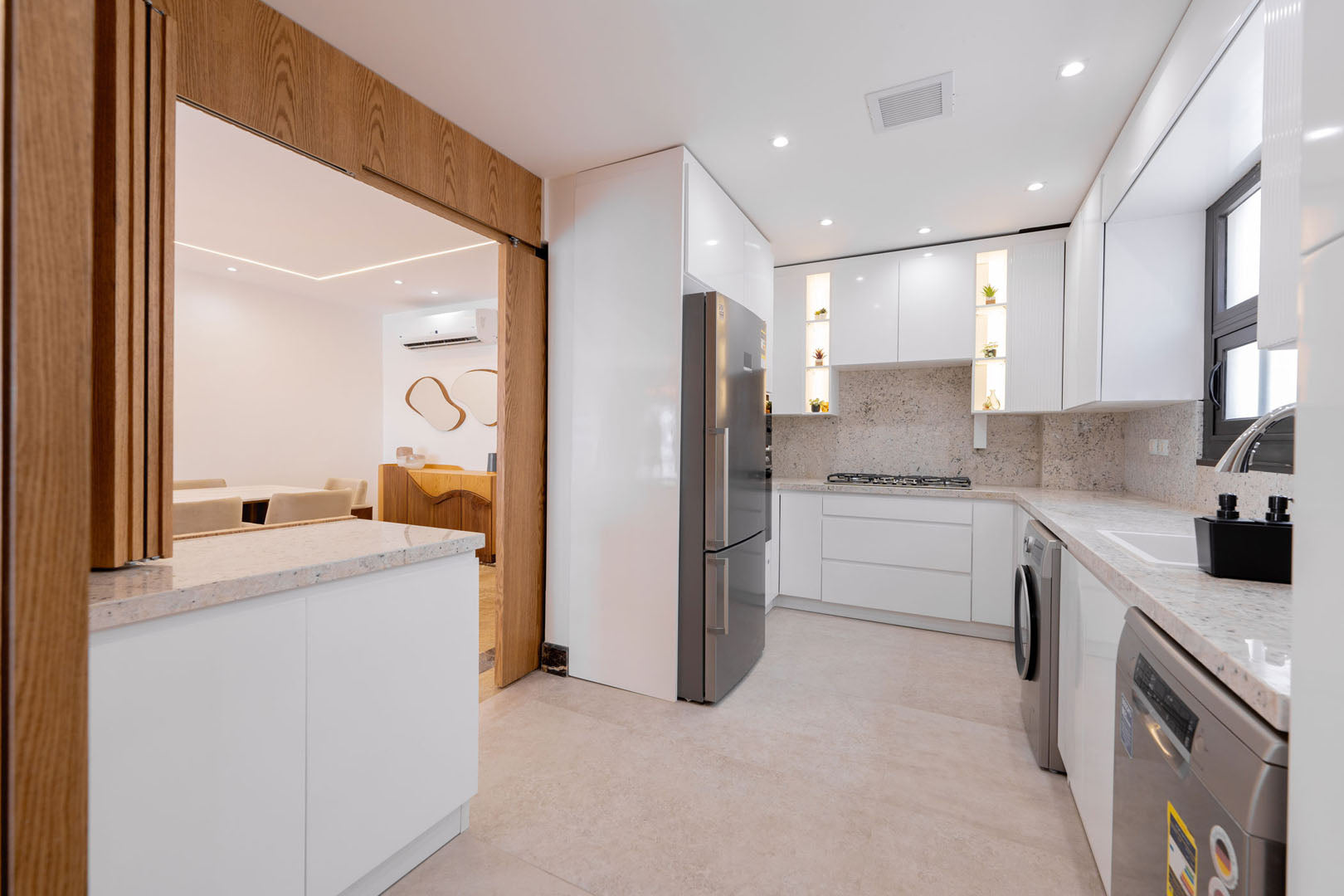 This precision-engineered American White Kitchen incorporates slidable wooden doors, offering sophisticated spatial flexibility. The premium sliding mechanism allows effortless transition between open-concept living and enclosed kitchen environments, providing acoustic isolation and visual containment when desired.